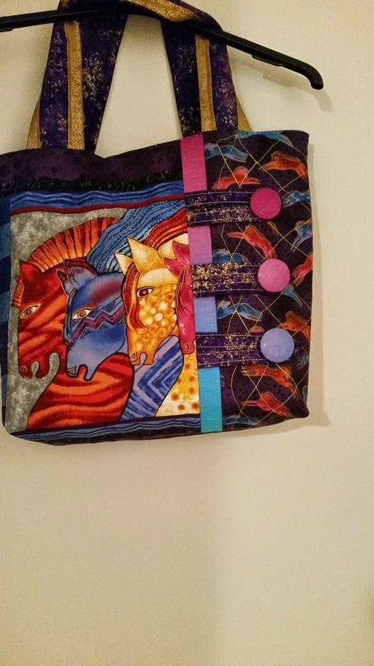 Here is a bag I completed over the weekend. The photos are of the front and back of the bag. It was inspired from a tote class some quilting friends did over the weekend. The pattern is called Button It Up! from Patti D. Designs. We picked it up at PIQF in October. The bag the designer did was using a Paris fabric but, I went another directions since I love purple and bright colors. It measures: approximately: 17x13x5. I also modified the straps adding a binding and widening them from the original design. My friend, Melodee Wade a long arm quilter showed me how.